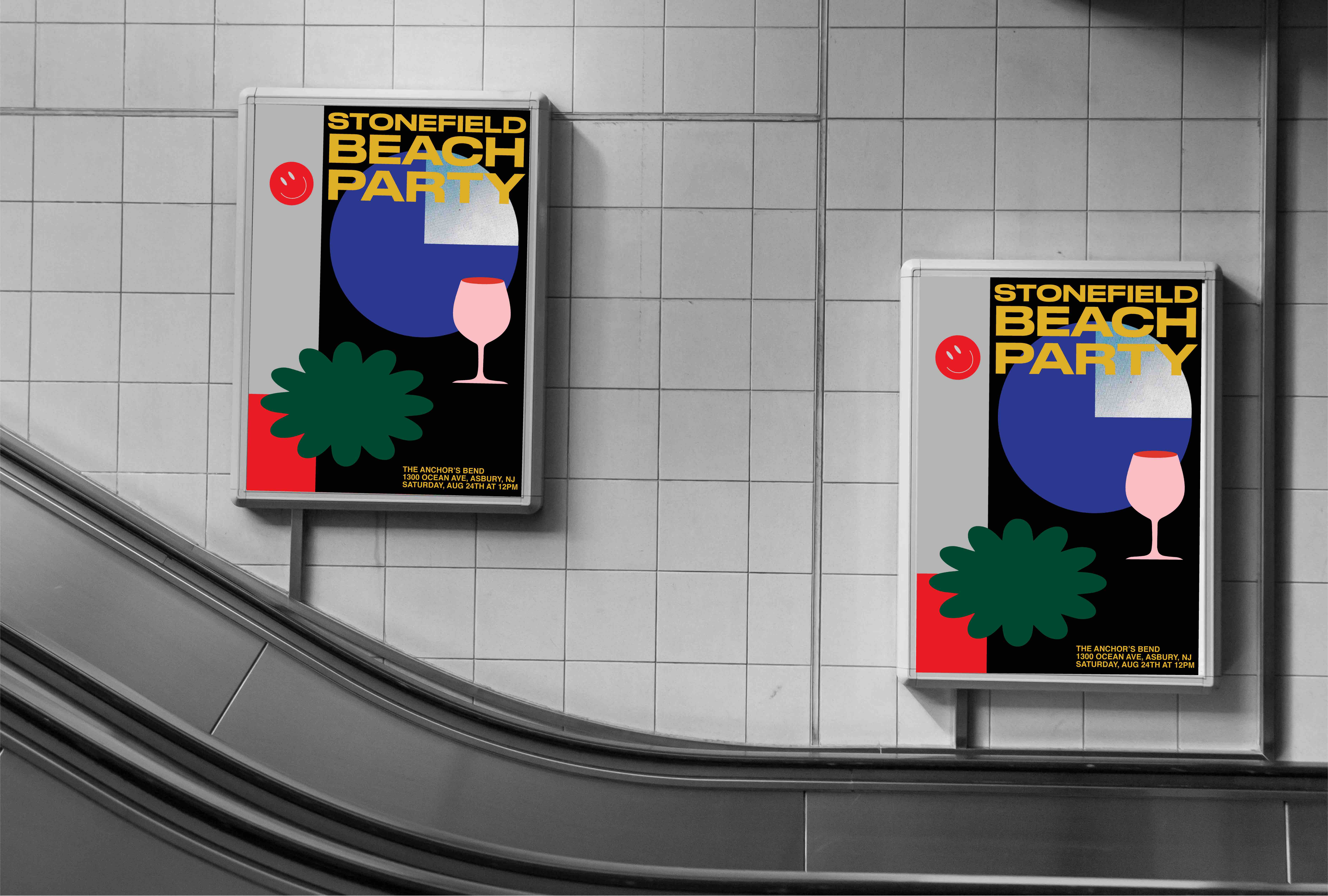 Stonefield是一家在纽约的城市规划设计公司,这个是为Stonefield夏天海滩派对所做的概念化项目。比起用一个很官方的调性,我希望这个项目是有趣和好玩的。我借用了夏日是一年中的1/4的概念,把layout以1/4的比例而分割,把1/4的正空间与其他的负空间区别开。这个项目中运用了一些扁平化的符号元素,葱郁的灌木,盛满的酒杯,在圆形中1/4的夏日,和那个熟悉的小笑脸。以黑色为背景,通过冷暖色系的叠加和碰撞,营造了一种热烈且不同寻常的氛围